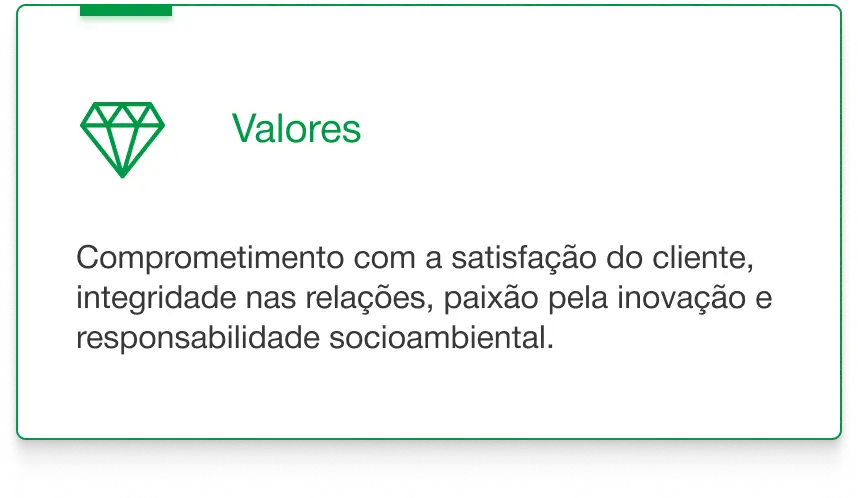 e responsabilidade. Comprometidos com práticas ecológicas, em constante busca de soluções que respeitem o meio ambiente, seja agora ou no futuro, o desenvolvimento sustentável é uma virtude, e um valor que iremos cumprir rigorosamente.